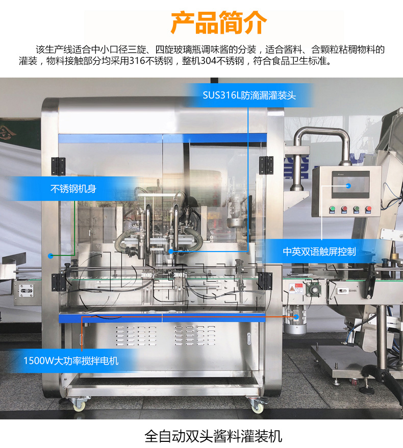 該生產(chǎn)線適合中小口徑三旋、四旋玻璃瓶調(diào)味醬的分裝,適合醬料、含顆粒黏稠物料的灌裝,物料接觸部分均采用316不銹鋼