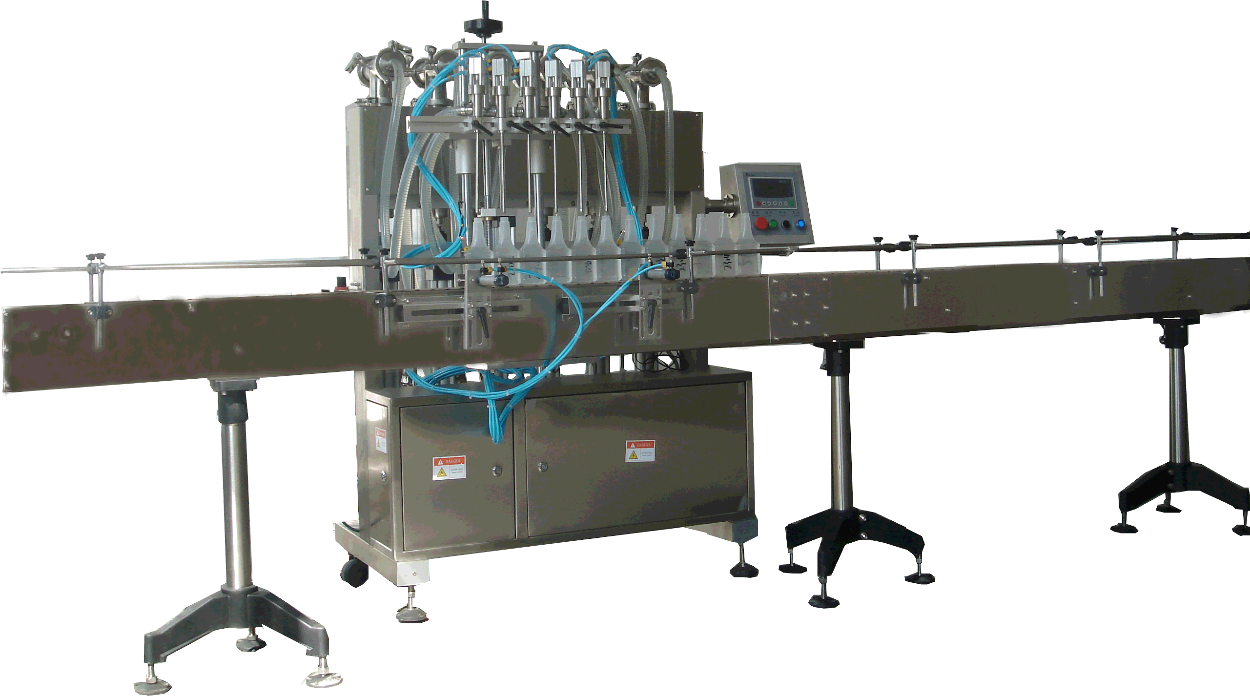 1、灌裝生產(chǎn)線采用特制加工的灌裝閥,大功率真空泵,包裝灌裝后液位一致。