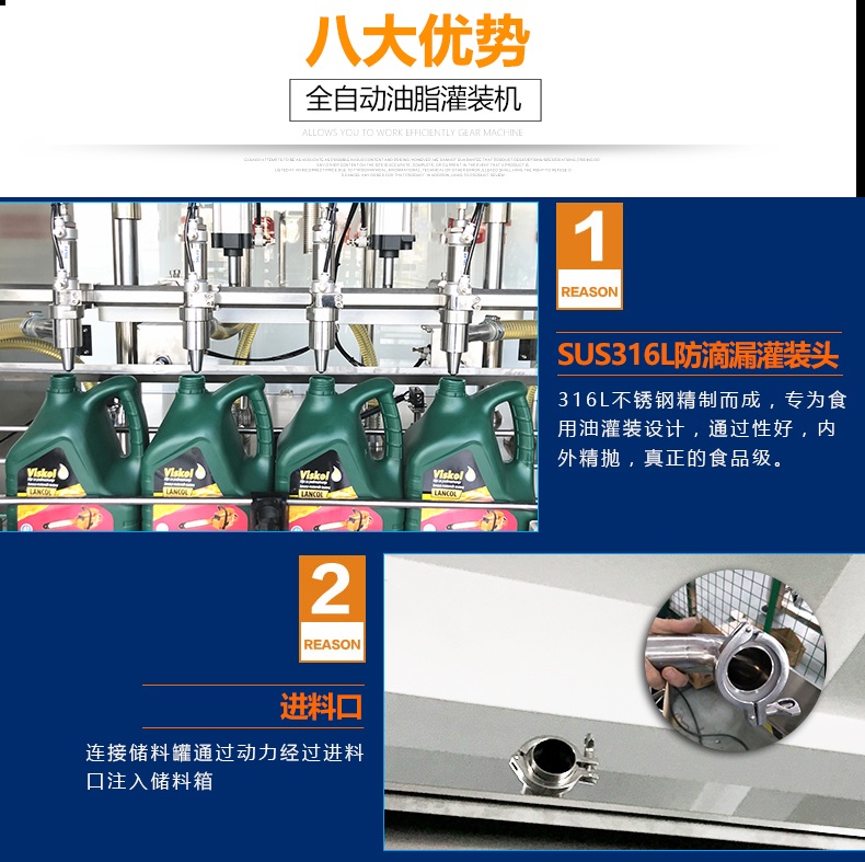 本機是根據(jù)潤滑油的特性而設(shè)計的一款全自動稱重式潤滑油灌裝機,該機設(shè)計緊湊合理,外形簡潔美觀大氣,灌裝量調(diào)節(jié)方便,精度高,借鑒灌裝流程控制技術(shù),進口彩色觸摸屏人機界面,灌裝進程實現(xiàn)一鍵式操作,性能穩(wěn)定。采用兩個316儲油箱解決灌裝量大的問題,一個進油口控制兩個油箱的液位,一個儲油罐分別控制5個灌裝頭,速度更快,精度更高。