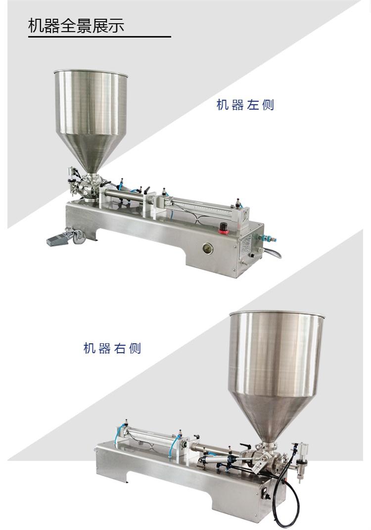 氣動膏體灌裝機(jī)主要適用于化工、食品、日化、藥品、農(nóng)藥、潤滑油等行業(yè)的液體膏體等物質(zhì)的定量灌裝,該灌裝機(jī)缸體、機(jī)殼、料斗均由不銹鋼材質(zhì)制成,活塞有四氟乙烯材料制成,氣動部分均采用氣動元件,符合GMP[要求,氣動膏體灌裝機(jī)的灌裝量和灌裝速度可任意調(diào)節(jié),擁有腳踏開關(guān)和自動灌裝功能,精度高,結(jié)構(gòu)簡潔,操作便利。